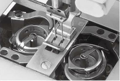 旋梭勾线,构成两行平行的双线锁式线迹。针杆摆动与机针同步