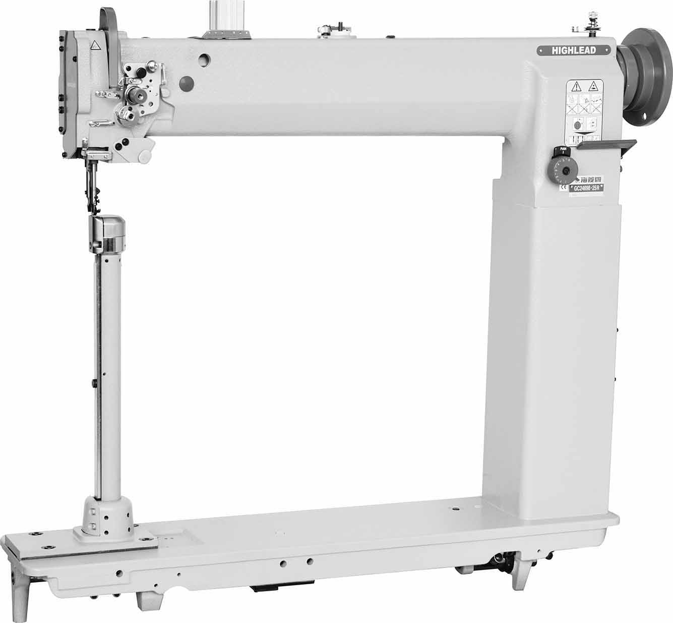 本系列机型是海菱原GC24698系列机型的加长版。保留了原机型综合送料方式和超高立柱式缝台的特点,机头上部和底座比原机型加长了约一倍,使操作空间极为宽敞。根据缝制品的需要,本系列机型分为双针、单针左缝台(L)右缝台(R),缝台采用经改进设计的针板,适用于缝制大型立体及小曲度的物品。本机采用大功率伺服电机驱动,采用气动抬压脚,气动倒缝,操作轻松简便,缝纫顺畅自如。
